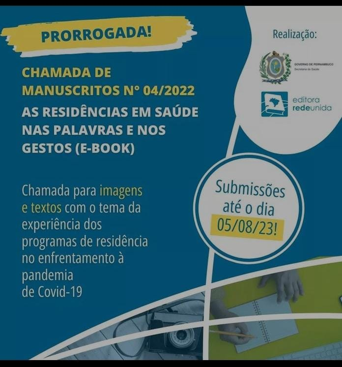 A Associação Brasileira Rede Unida (REDE UNIDA) e a Secretaria Estadual de Saúde de Pernambuco lançam chamada para manuscritos para a publicação de dois livros no formato e-book: As Residências em Saúde nas palavras e nos gestos: registros imagéticos de uma formação em defesa do Sistema Único de Saúde; As Residências em Saúde nas palavras e nos gestos: